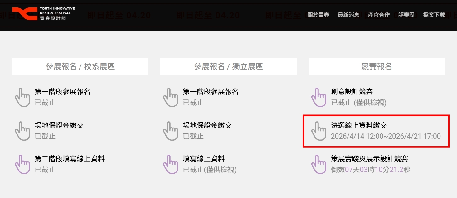 1. 決選線上資料繳交時間為2026/4/14(二)中午12:00 - 4/21(二)17:00